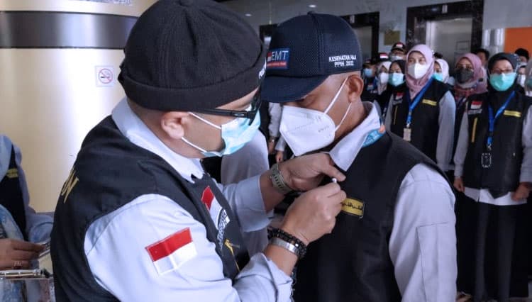 TIMES Palopo/Kapuskes Haji Kemenkes Budi Sylvana saat menyematkan pin kepada petugas kesehatan haji. (FOTO: dok. Kemenkes)