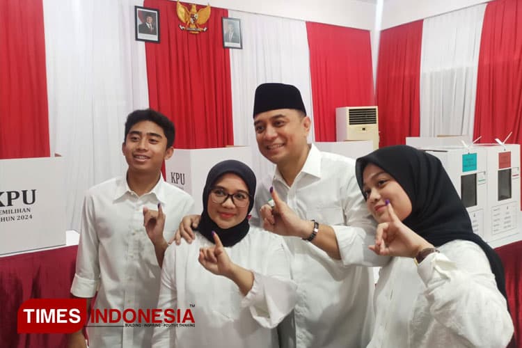 Diketahui Eri Cahyadi bersama keluarga mencoblos di TPS 04 Kelurahan Karah. Kedatangannya ke lokasi pemilihan diiringi dengan hadrah. (*)